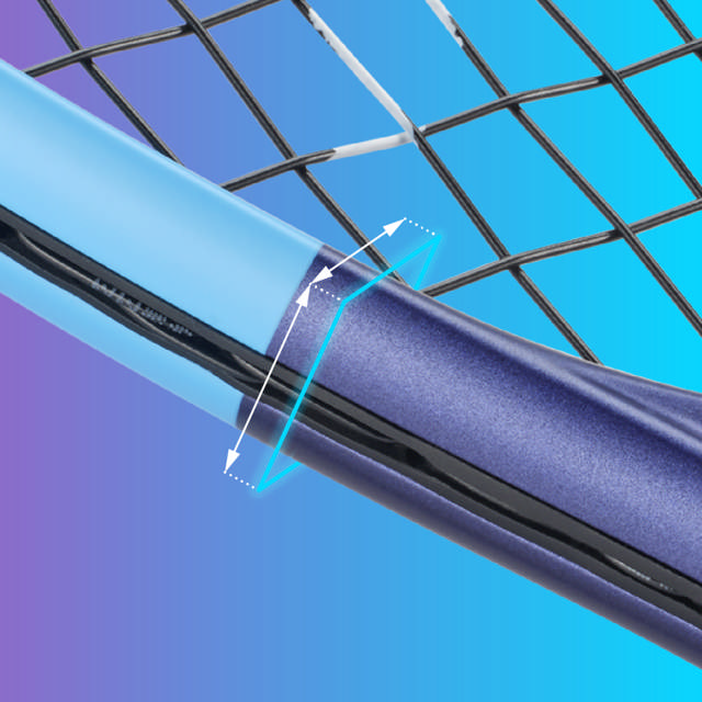 Added frame thickness at 3~5 and 7~9 o'clock area, increases the racket stiffness to create greater ball speed. The thicker frame creates a larger sweet spot increasing ball speed at the top of the racket.