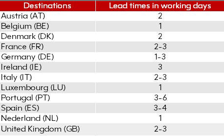 We deliver to the following countries: Austria, Belgium, Denmark, France, Germany, Ireland, Italy, Luxembourg, Nederland, Portugal, Spain, United Kingdom.
